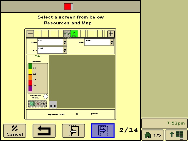 You will be presented with a page that tells you to pick an information source. You will need to choose GS3. You will will use the page icons at the bottom to advance to page 2 of 14. This page will have a harvest map and boxes to select you client, farm, and field data.